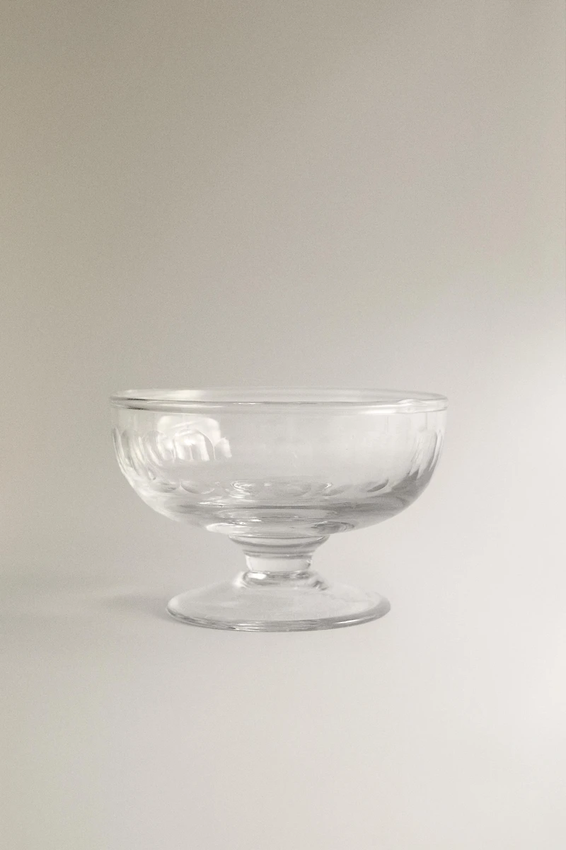 Ice cream cup made of transparent glass, with a simple and timeless design. It has a cylindrical shape with a slightly narrower and reinforced base, which provides stability. The lower part incorporates subtle vertical grooves, which add a slight decorative detail without losing the clean aesthetic of the set.