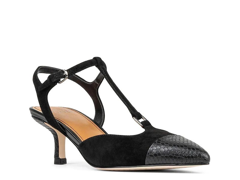 Enjoy classic style with mod touches in the Cyrca pump from Donald J. Pliner. The timeless T-strap silhouette gets a boost with metallic hardware and an embossed pointed toe that catch the eye and round out your look.