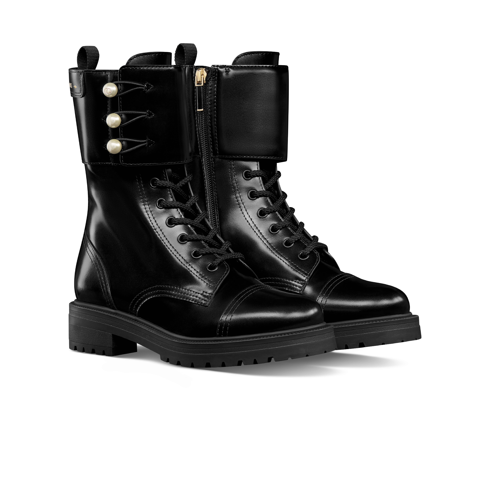 The D-Strike ankle boot adds couture details to a bold silhouette. Presented in black matte calfskin, the style stands out with a wide band adorned with functional white resin pearls, inspired by the iconic Dior Tribales earrings. A gold-tone CD signature on the top resin pearl and rear Christian Dior Paris signature as well as an ultralightweight EVA sole complete the modern ankle boot. Main composition: calfskin. Calfskin lining. Gold-tone Christian Dior Paris signature on the back. Decorative CD resin pearl. Side zip closure. Rear tab. Notched EVA sole with star, Christian Dior's lucky symbol. Made in Italy
