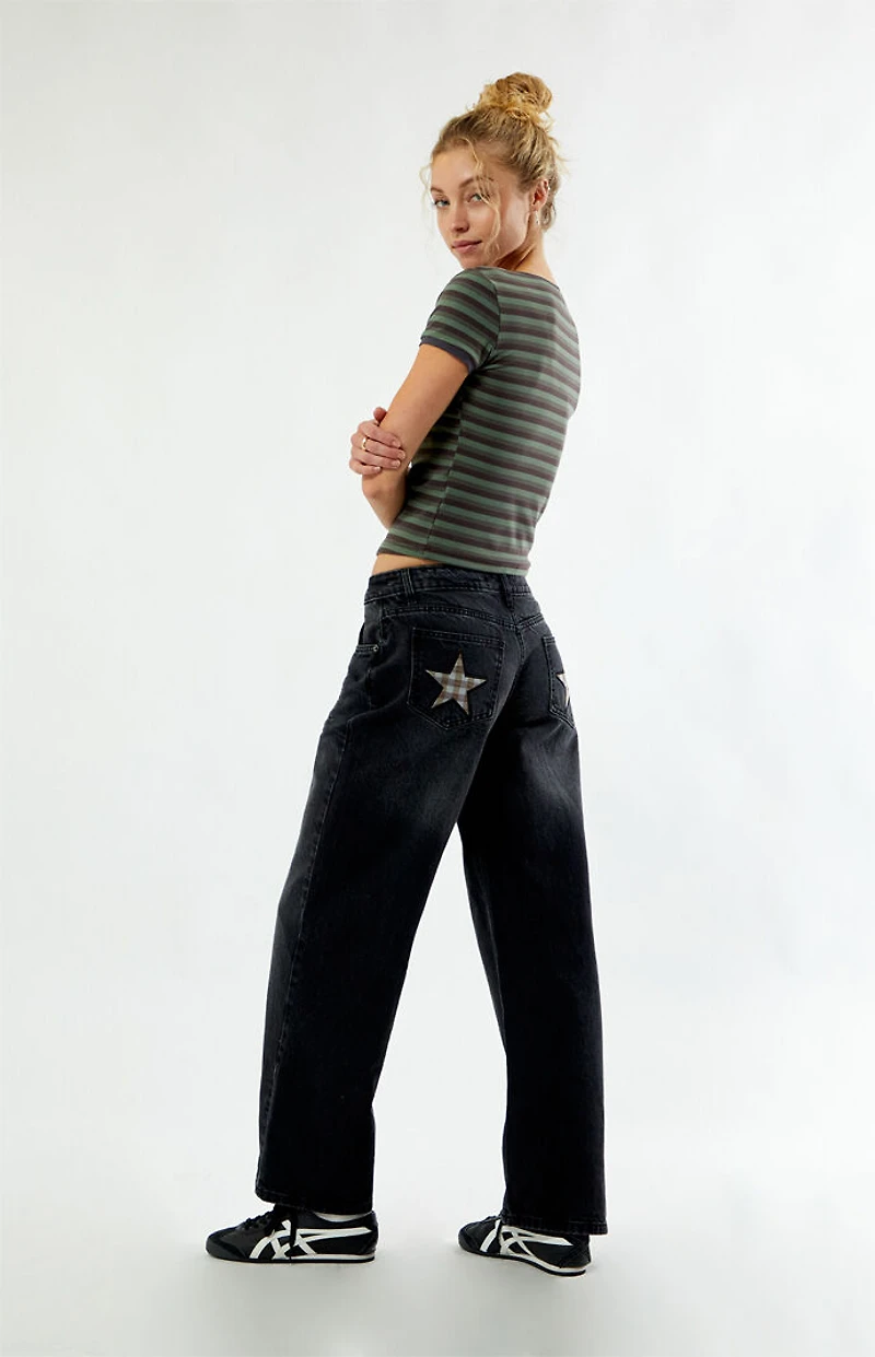 The Black Mid Rise Baggy Jeans from Daisy Street are a bold, street-ready staple with playful, standout details. Featuring a black wash with rigid fabric, 5-pocket body, zip fly closure, wide leg openings, baggy relaxed fit, and plaid print star patches on the back pockets, they bring effortless edge to any casual look.
