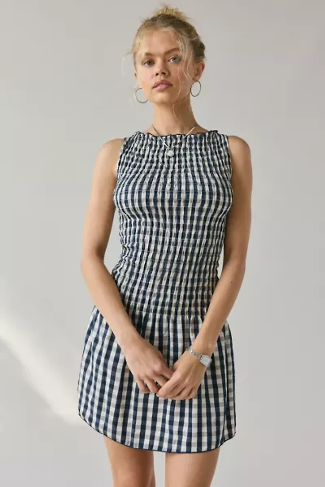 Daisy Street Gingham Seersucker Boatneck Smocked Mini Dress