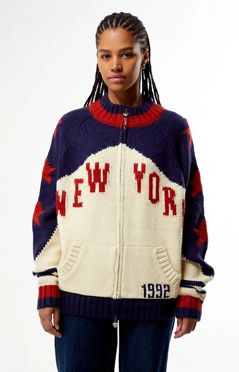 This Daisy Street zip-up sweater makes a bold statement with standout knit details front to back. It features a colorblock design, mock neckline, long sleeves, a full zipper front closure, side hand pockets, New York knit detail across the front, Brooklyn NYC American flag knit detail at the back, and star knit details down the sleeves.