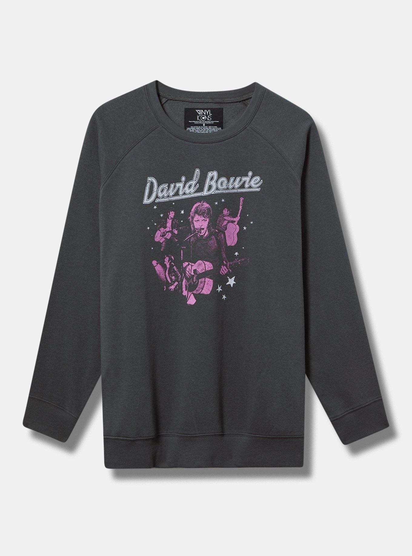 FIT Easy classic fit: Fitted up top, eased through the body. Measures 30" from shoulder (size 2). Raglan silhouette. MATERIALS + CARE Cozy Fleece knit fabric: Our essential fleece has a brushed warm interior and a lived-in, casual look. Stretch level: Minimum. 60% cotton, 40% polyester. Machine wash cold. Tumble dry low. Imported. DETAILS Crew neckline. Long sleeves. David Bowie graphic.
