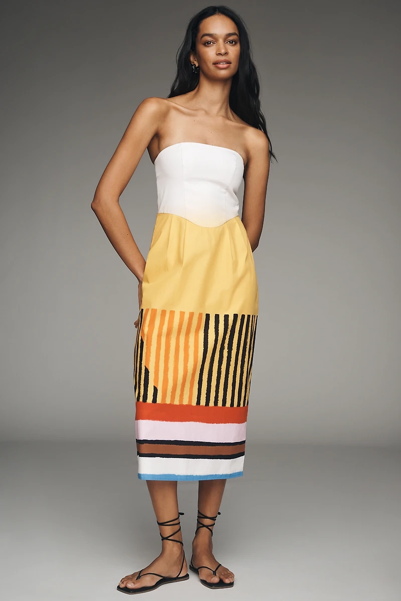 Cut from breathable cotton poplin, this midi dress features a structured, paneled bodice and a vibrant, graphic-print skirt. The slim-fitting silhouette is finished with a secure back zipper and includes removable straps for versatile styling options.