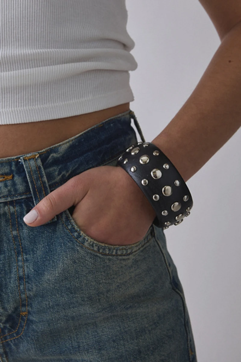 Make a statement with this metal studded bracelet. The chunky, wide silhouette and polished metal studs give it a bold edge perfect for stacking.
