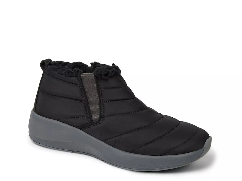 You just can't miss the cuddly look and comfort of this Original Comfort by Dearfoams Dear wedge bootie! Beautiful quilted upper of this slip-on bootie is enhanced with comfortable double gores, cozy insole with added cushion and arch support, and lightweight, durable sole that ensures confident strolls and shock-absorption.