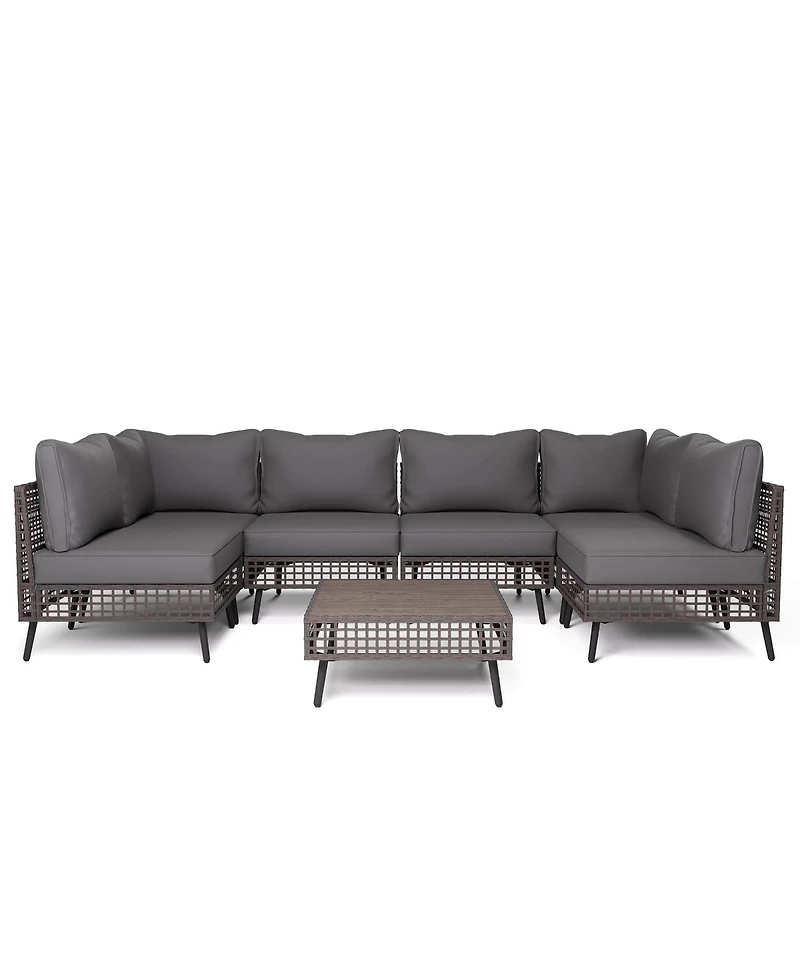 Experience the perfect blend of style, comfort, and versatility with this 7-piece modular outdoor sofa set. Designed to help you create your ideal outdoor living space, this set includes 2 corner chairs, 4 armless chairs, and 1 versatile coffee table, allowing you to freely arrange and reconfigure the pieces to match your layout and aesthetic. The modular design adapts effortlessly to any space, whether you're creating an inviting conversation area, a spacious lounge, or a flexible seating arrangement for entertaining. Crafted with fade- and water-resistant polyester fabric, the set withstands sun and rain while maintaining its vibrant appearance season after season. Sink into exceptional comfort with 5-inch high-resiliency foam cushions that provide plush support for hours of relaxation. Underneath lies a robust galvanized steel frame engineered for lasting durability, with each chair supporting up to 300 lbs.