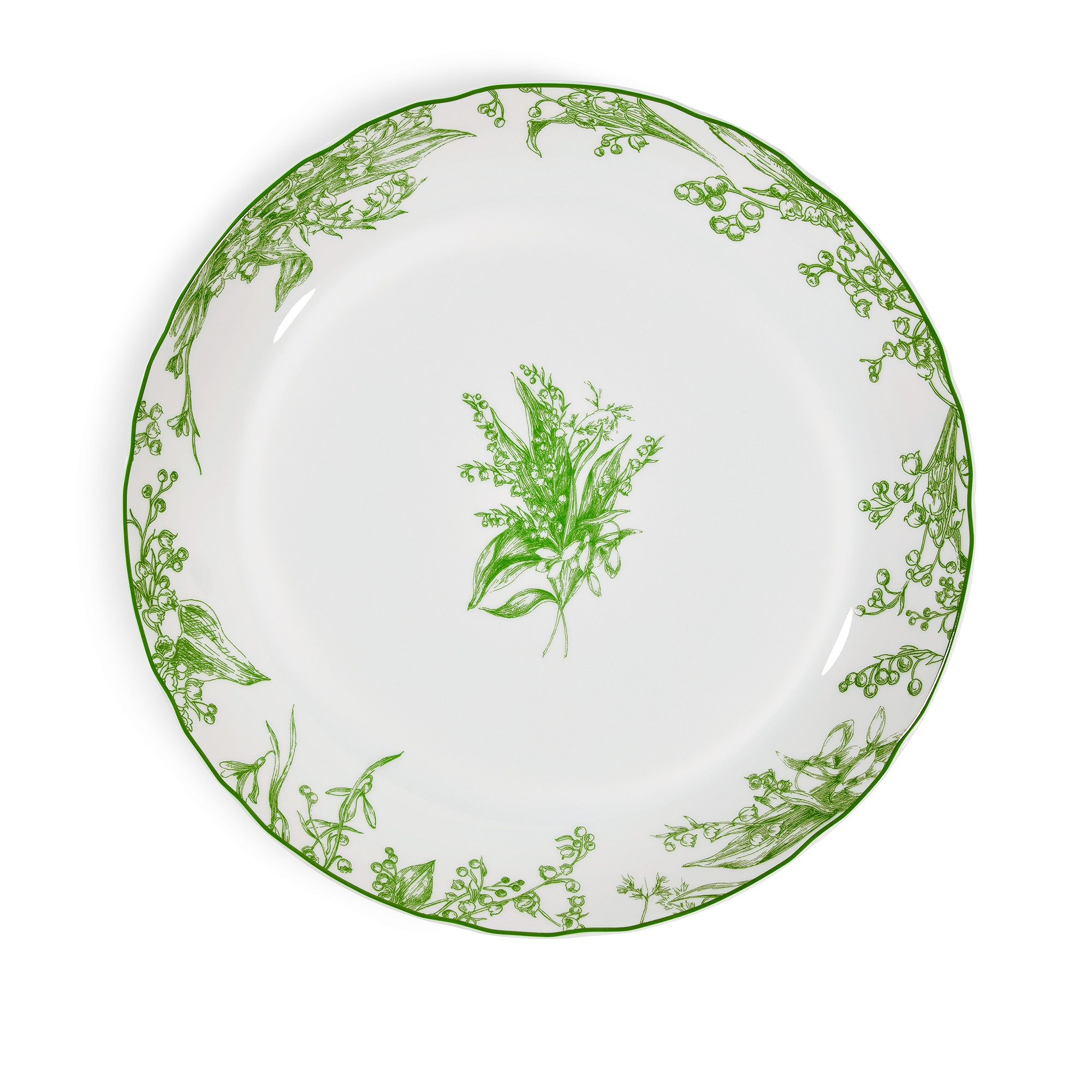 Christian Dior was particularly fond of lily of the valley, a symbol of the fine weather heralding the arrival of spring and the haute couture season. He sewed a dried sprig into the hem of each dress as a sign of good luck. An emblem of renewal, the printed and embroidered lily of the valley flourishes on House creations, its evocative name and white color adorning a multitude of silhouettes, like the Bonheur wedding dress. A tribute to Mr. Dior's love, the Lily of the Valley collection by Cordelia de Castellane is enhanced by new pieces dedicated to tableware. The delicate lily of the valley accents a range of creations, including two decorative porcelain objects, a pasta plate, cereal bowl, three-tiered cake stand, oval platter and deep round platter. The line is an ode to good fortune and a promise of sophisticated elegance.