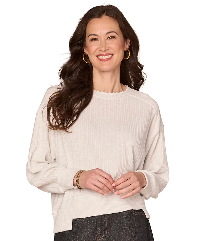 Democracy Petite Long-Sleeve Crewneck Mixed Media Knit Top