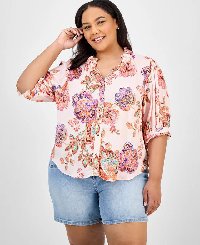 Democracy Trendy Plus Floral-Print Ruffle-Trim Blouse