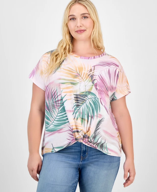 Democracy Trendy Plus Printed Twist-Front Short-Sleeve Top