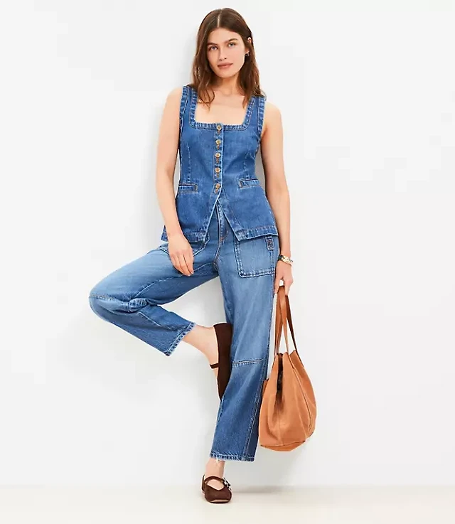 Denim Square Neck Pocket Vest Top in Classic Mid Wash
