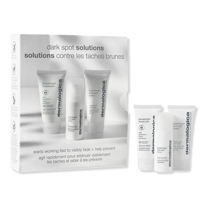 POWERBRIGHT KIT 1.0OZ. Benefits: Fade: start fading the appearance of dark spots within days. Defend: daily moisturizer helps shield against dark spots. Restore: nourishing nighttime cream optimizes skin moisture recovery and helps restore luminosity. Balances skin tone and helps reduce the appearance of uneven pigmentation. In an independent clinical study, Dermalogica's Powerbright Dark Spot Serum: Starts fading dark spots in 1 week Begins reducing dark spots size in 4 weeks Reduces the number of dark spots in 8 weeks. Key Ingredients: Niacinamide, Hexylresorcinol and Vitamin C: helps reduce the appearance of uneven pigmentation and balance skin tone for glass-like skin. Pumpkin Enzyme: smoothes and evens skin texture. Antioxidant-rich Cranberry and Raspberry Seed Oils: help protect against the damaging effects of free radicals from pollution, and deliver essential fatty acids that moisturize to help reduce the appearance of fine lines. Licorice Extract: helps soothe the skin. Hyaluronic Acid: ultra-hydrating and helps to strengthen skin's moisture barrier, reducing the appearance of fine lines. Includes: PowerBright Dark Spot Serum(0.34 oz). PowerBright Moisturizer SPF50 (0.40 oz). PowerBright Overnight Cream(0.50 oz).