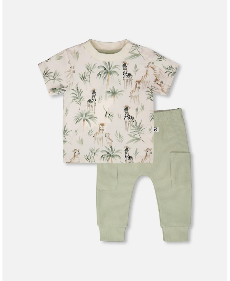 Deux par Baby Boys Cotton Jersey T-Shirt and Rib Pants Set Beige Zebra Print Sage Green