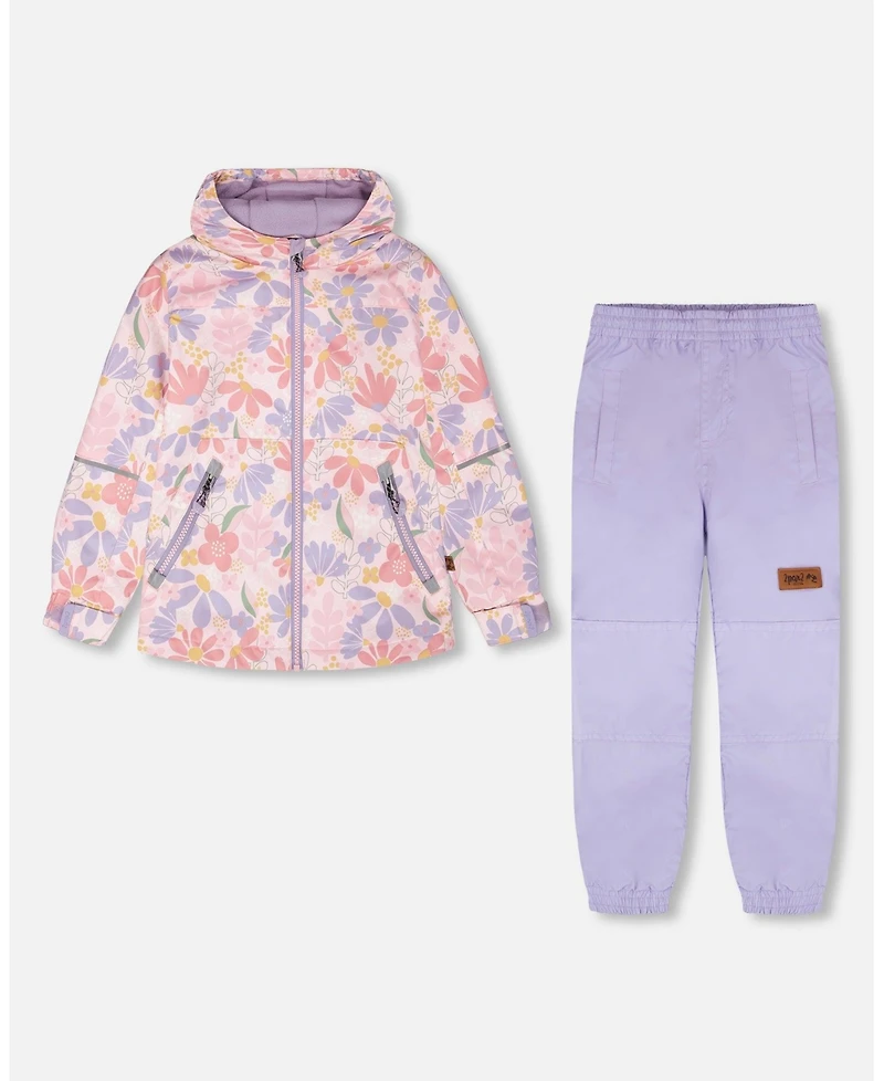 Stylish and practical, this two-piece mid-season outerwear set in pink with flower print is designed to keep young girls warm, dry, and comfortable through every spring adventure. The insulated jacket and pants feature a fluorocarbon-free Bionic-finish coating, ensuring water and dirt repellency without harmful chemicals. With details like a fleece-lined hood and jacket, adjustable waistband, reinforced knees, and reflective trims, this durable set blends innovation with cozy everyday wear.