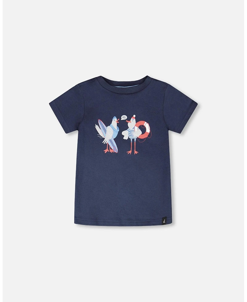 The cotton short sleeve t-shirt in blue is a comfy essential with a playful spirit. This classic tee features a round neckline, short sleeves, a fun seagull graphic print, and a simple design that makes it versatile for everyday adventures. Made from soft cotton with a touch of stretch, it pairs perfectly with the fun bottoms from the “Coastal Days” collection.