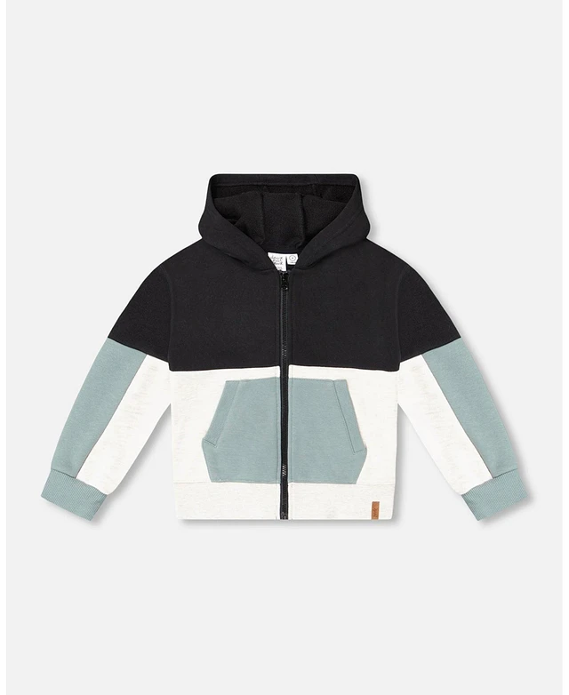 Deux par Deux Toddler Boys French Terry Color Block Full Zip Hoodie Cardigan Sweatshirt Black, Teal And Shimmer - Toddler|Child