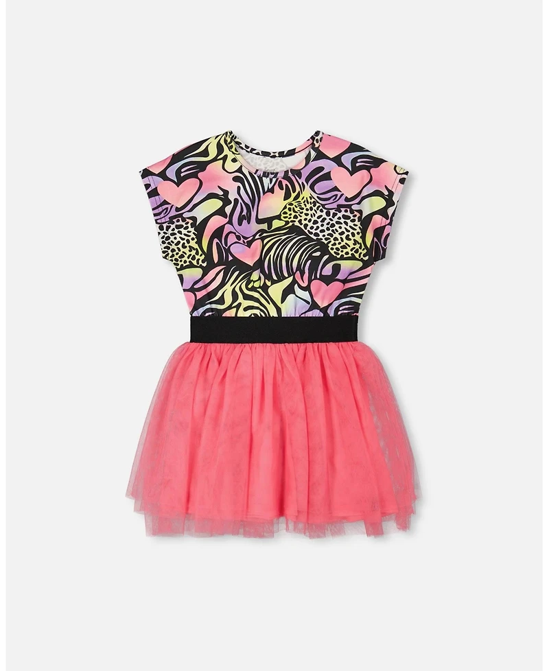 This bi-material dress in black with multicolor print is a bold statement piece from the “Wild Heart” collection. This dress has a jersey bodice bursting with a mix of animal and heart prints, while the layered pink mesh skirt adds playful volume and contrast. An elastic waist ensures comfort and a secure fit, crafted in cotton and polyester for both ease and flair.