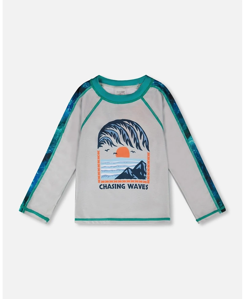 The long sleeve rashguard in pale gray keeps boys protected and stylish under the sun. This swim top features long raglan sleeves with contrast panels and a front print reading “Chasing Waves,” made from polyester with added stretch for comfort and flexibility. Quick-drying and easy to layer, it s the perfect choice for all-day water fun.