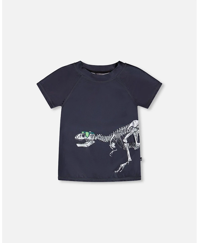 This short sleeve rashguard in black combines cool style with sun-ready protection. This swim top features short contrast sleeves and a bold front print of a dinosaur skeleton wearing sunglasses, crafted from polyester with stretch for comfort and easy movement. Quick-drying and lightweight, it keeps boys comfortable during long days of water play.