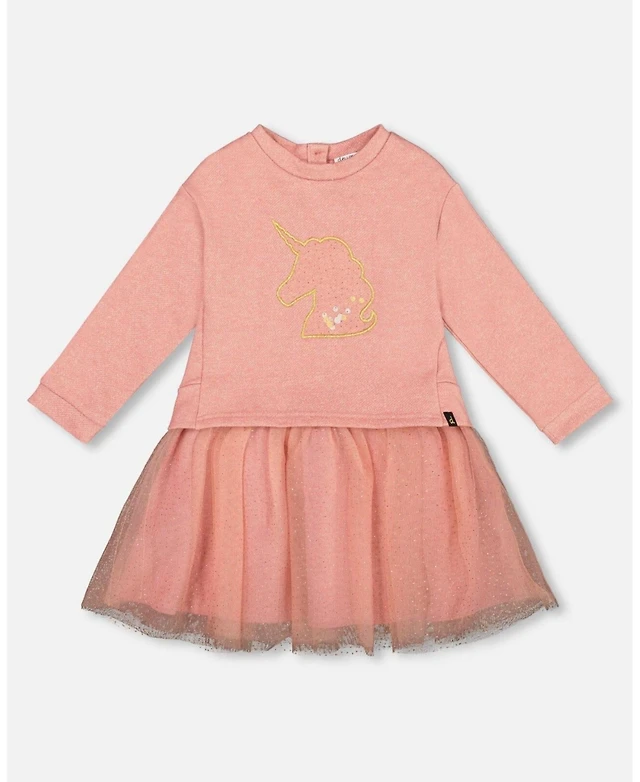 Deux par Deux Girl Bi-Material Dress Dusty Pink with Mesh Skirt and Unicorn - Toddler|Child