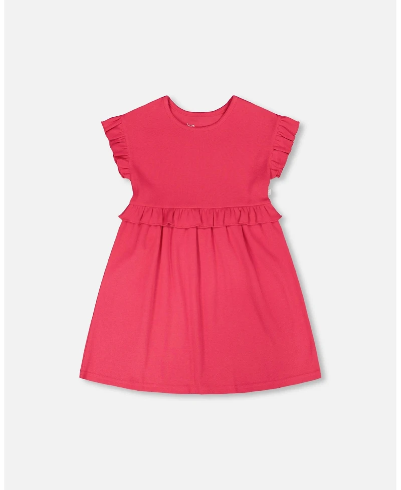 The cotton rib dress in pink is a sweet and simple piece with playful charm. This dress features short ruffled sleeves, a gathered frilled waist, and a softly flared skirt for everyday comfort. Made from a cotton-rich rib fabric with added stretch, it coordinates beautifully with the rest of our ""Cherry On The Check"" collection.
