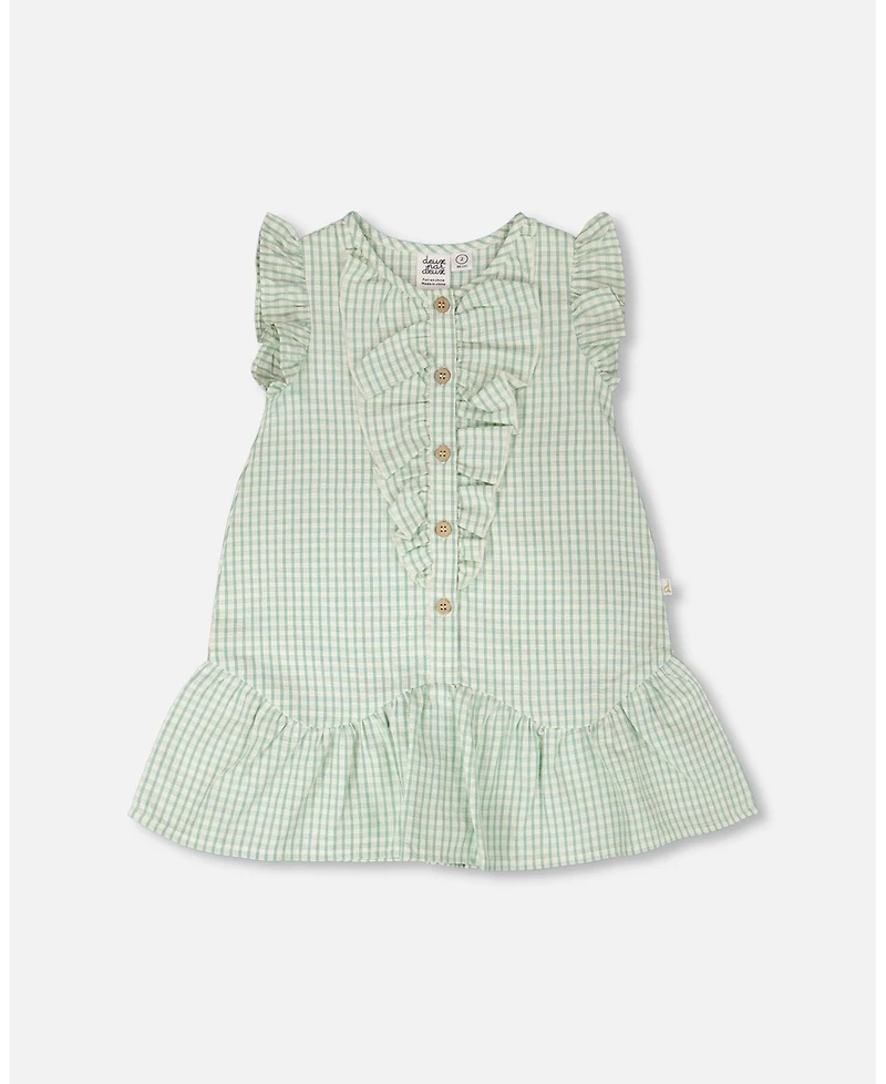 Our plaid poplin dress in green is a sweet mix of comfort and charm. This sleeveless A-line silhouette features flutter ruffles at the shoulders, a round neckline, and a button placket adorned with cascading ruffles on the chest. With its gathered flounce hem and classic plaid pattern, it s a playful choice for girls and baby girls.