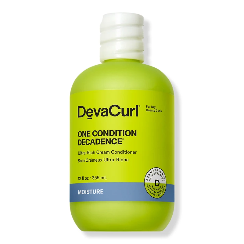 DEVACURL ONE CONDITION DECADENCE 12OZ. Benefits: Gives dry, coarse curls ultimate curl flexibility. Maintains moisture, hydrates & smoothes curls. Leaves curl feeling nourished. Softens & conditions curls. Maintains shine, encourages curl shape and definition, enhances curl body and shape, rinses clean from hair with no buildup & improves manageability and combability. Features: Moisture preserving blend helps fight tangles, control frizz and leave curls feeling nourished, soft & bouncy. Dermatologist co-developed, backed by science & stylist approved. A refreshing, clean Green Oasis scent that starts with nature-inspired notes of green leaf, nashi pear plus crisp apple, waterlily and lily of the valley & finishes with creamy woods and musk. Bottle made from 50% recycled ocean bound plastics. Gluten-free. Formulated Without: SLS/SLES sulfates. Silicones. Parabens.