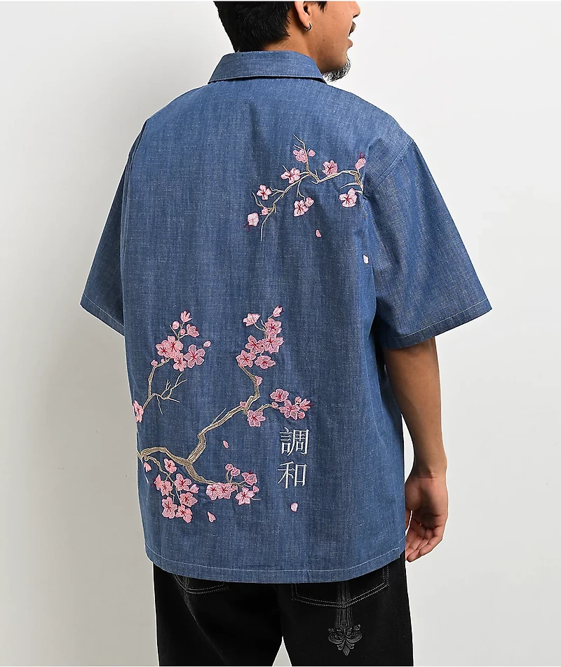 A denim-inspired blue base sets up the Eternity quarter zip work shirt from Dirty Ghetto Kids with embroidered cherry blossoms blooming across the back. The mix of utilitarian details and delicate artwork adds depth without sacrificing the comfortabi
