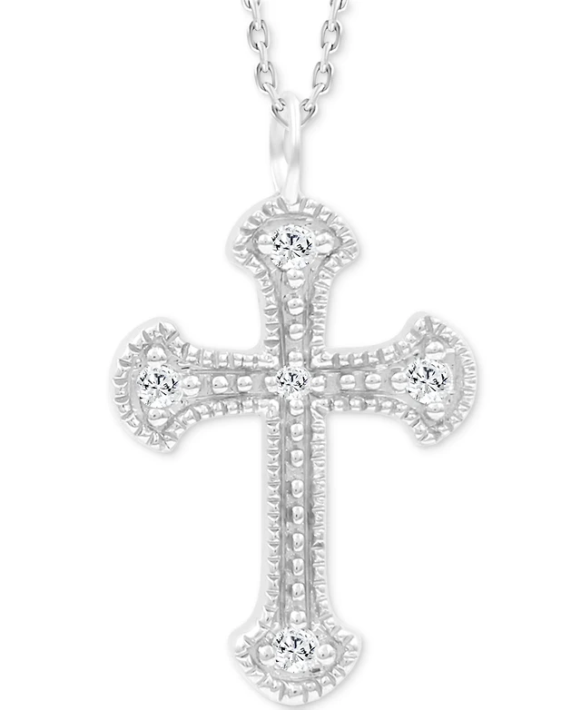 Diamond Beaded Cross Pendant Necklace (1/20 ct. tw) in 14k White Gold, 16" + 2" extender