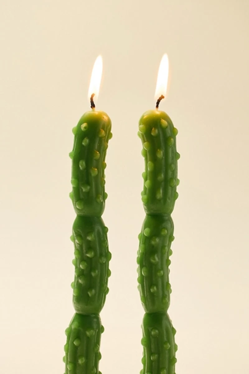 Pickle your home décor with these taper candles featuring a stacked dill pickle silhouette. To get your candle to fit in your favorite taper candle holder, simply melt the base to the necessary size. Available exclusively at Urban Outfitters.