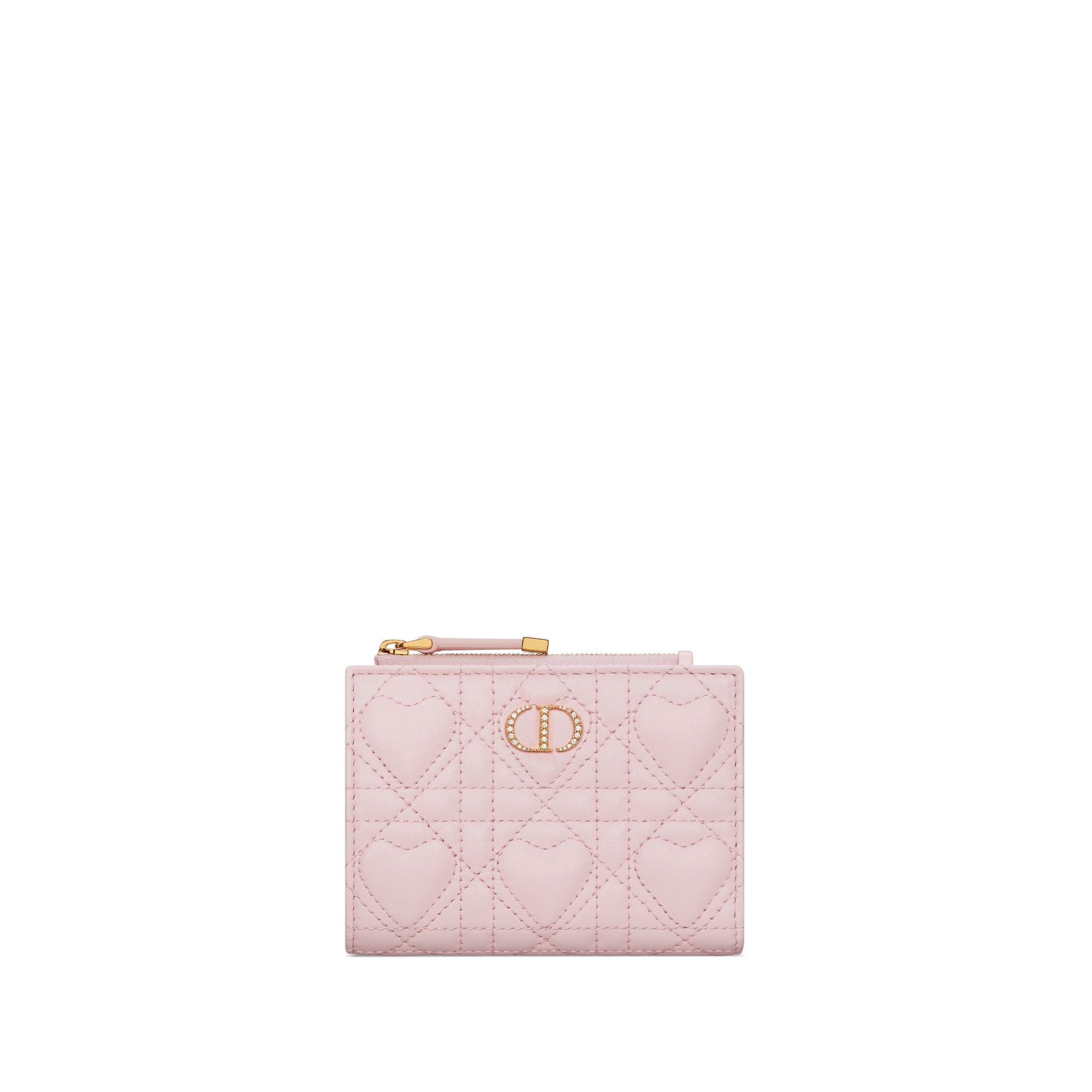 The Dior Caro Dahlia wallet in macaron pink lambskin with Cannage stitching is enhanced by a heart motif. The front is adorned with the CD signature in gold-finish metal delicately embellished with a pavé of white crystals. A chic and spacious companion, the wallet can be paired with bags from the Dior Caro line. Main composition: lambskin. Lambskin and technical fabric lining. CD signature with crystals on the front. Six card slots. Four slip pockets. One bill compartment. One zip pocket. Snap closure. Made in Italy