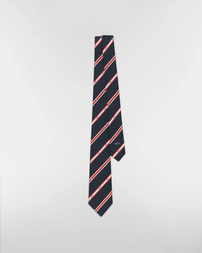 The Dior Club tie marries House codes of modernity and refinement. Made in burgundy, navy blue and gray silk jacquard, it features stripes enhanced by Dior and CD signatures. The tie will elevate any suit with a graphic touch.