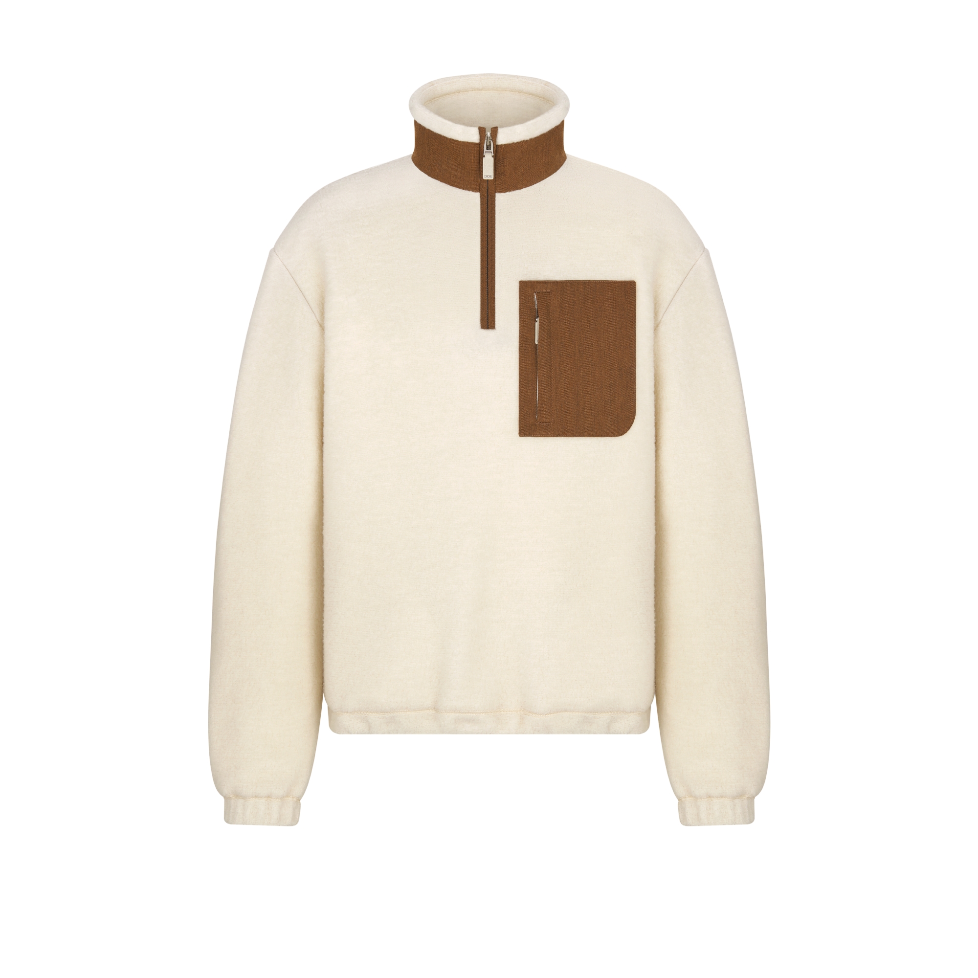 New for Spring 2026, the Dior Icons sweatshirt offers a new take on a sportswear classic, channeling House codes into an elegant and understated style. Crafted in white cashmere and virgin wool fleece, it features a zipped stand collar, as well as a contrasting patch pocket on the chest and neckline details. The sweatshirt will pair with jeans for a chic yet laid-back look. Contrasting fabric on the neckline and pocket. Dior embroidery on the pocket. Zipped stand collar. Zipped chest pocket. Elastic cuffs. 67% cashmere, 33% virgin wool and lining: 51% cotton, 49% viscose. Made in Italy