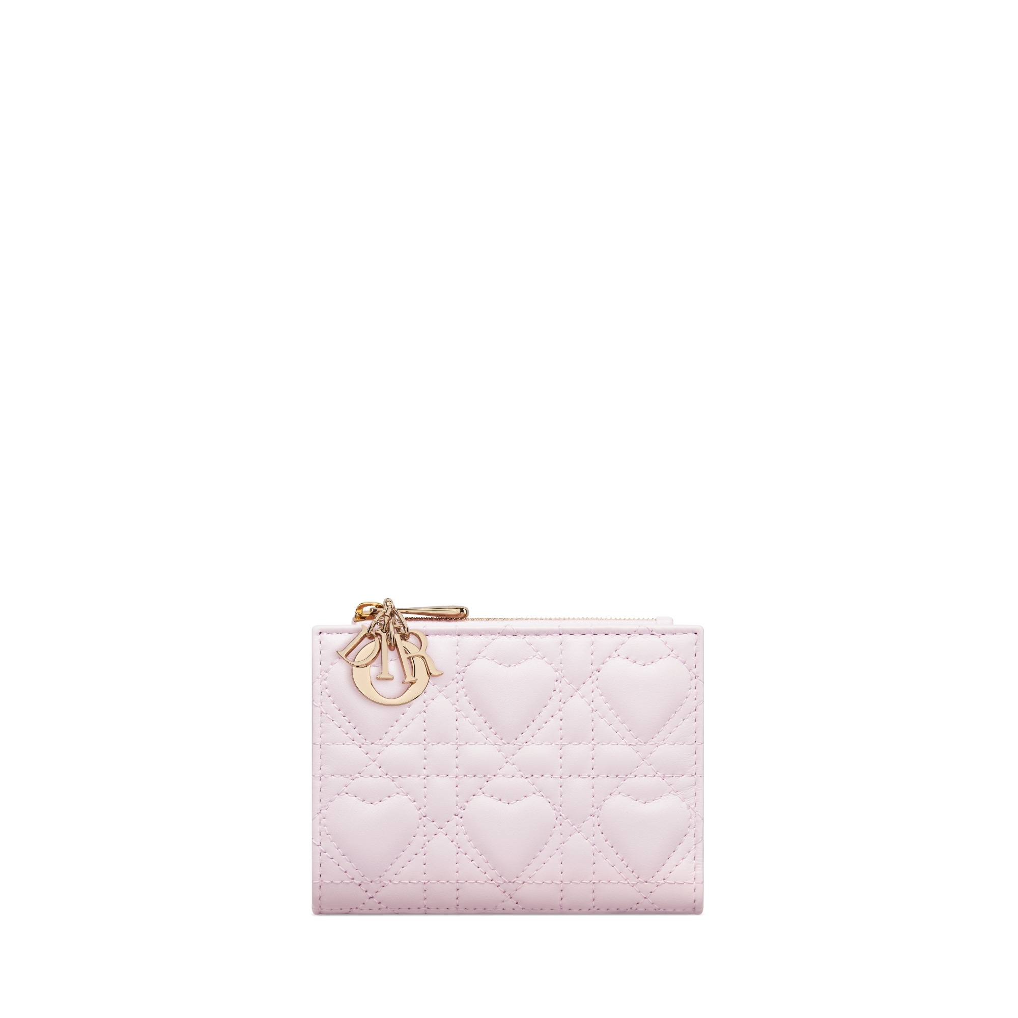 Part of the Dior Lucky capsule, the Lady Dior Dahlia wallet presents an elegant and practical style. Crafted in pale pink lambskin, it features Cannage and heart motif topstitching. Completed by detachable D.I.O.R. charms in pale gold-finish metal, the chic and spacious companion will fit anywhere and can be elegantly coordinated with other Dior Lucky creations.