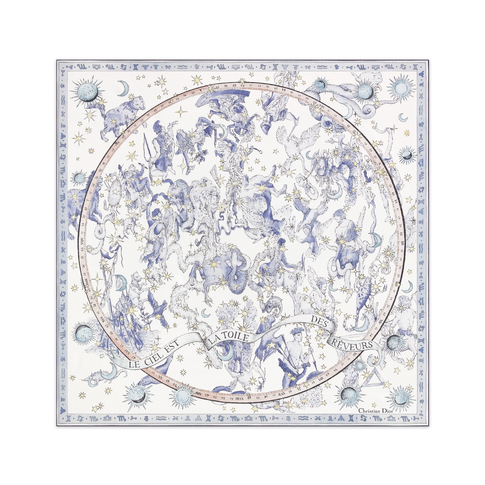 The square scarf showcases Pietro Ruffo's Dior Night of Dreams print, featuring a night sky filled with sea monsters, winged horses and mythological figures, as well as the quote 'Le ciel est la toile des rêveurs' (The sky is a canvas for dreamers). The edges are decorated with a frieze depicting the zodiac signs. Crafted in white and blue silk twill, the double-sided style has contrasting rolled edges and is enhanced by the Christian Dior signature. The square scarf can be worn tied around the neck or head to complete a Dior look. White and blue double-sided Dior Night of Dreams print. Christian Dior signature. Contrasting hand-rolled edges. 100% silk twill. Made in Italy