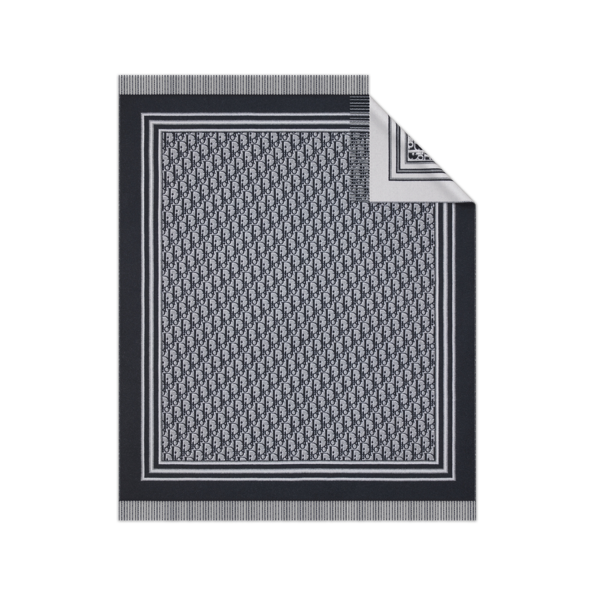 New for Spring 2024, the navy blue and gray blanket showcases the Dior Oblique motif, which first appeared on the House's creations in 1969. Crafted in wool and cashmere jacquard, it is embellished with contrasting selvedge detailing and fringed edges. The thick and warm blanket can be worn over the shoulders or elegantly draped over living room furniture. Navy blue and gray Dior Oblique jacquard. Fringed selvedge edges. 70% wool, 30% cashmere. Made in Italy
