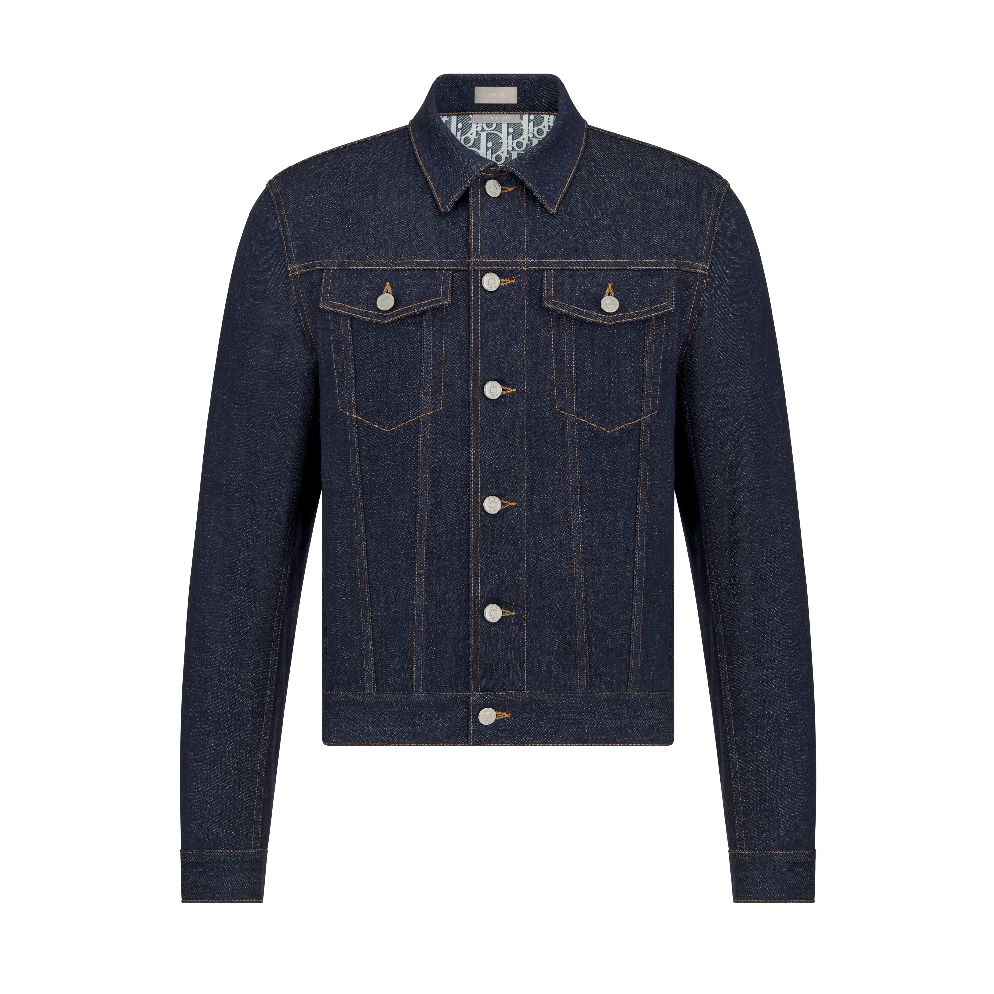 The jacket in blue raw cotton denim is distinguished by its Dior Oblique motif lining. Featuring a classic cut and patch pockets on the chest, it is enhanced by contrasting topstitching and silver-tone buttons engraved with the House signature while a leather jacron label with the Dior signature enhances the back. It can be paired with the matching jeans to complete the look. Dior Oblique motif printed cuffs. Contrasting topstitching. Visible button placket. Dior-engraved metal buttons. Leather jacron label with debossed Dior signature at the back hem. Chest flap pockets. 88% cotton, 11% polyester, 1% elastane. Made in Italy