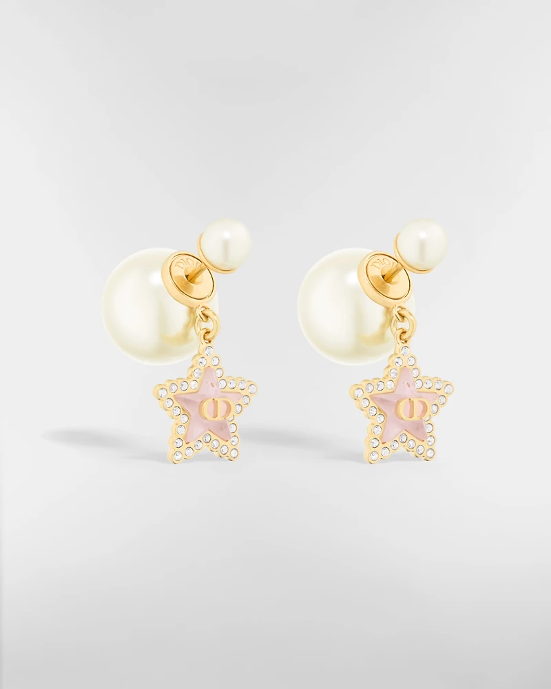 The Dior Tribales earrings have a modern design celebrating the House's codes of refinement. Hallmark resin pearls showcase Mr. Dior's cherished star in macaron pink glass, adorned with the CD signature and delicately surrounded by silver-tone crystals. The sophisticated, elegant earrings will pair well with other creations from the Petit CD Lucky Baroque line.