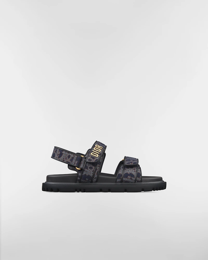 The Dioract sandal offers a modern silhouette in blue and tobacco brown Dior Oblique Denim fabric, offering a new take on the iconic House motif with contrasting topstitching channeling selvedge denim details. The style features an anatomically shaped insole made with ultralightweight and comfortable leather, as well as self-fastening straps enhanced by a gold-finish metal Dior signature on the upper strap. The sandal will lend a contemporary touch to any look.