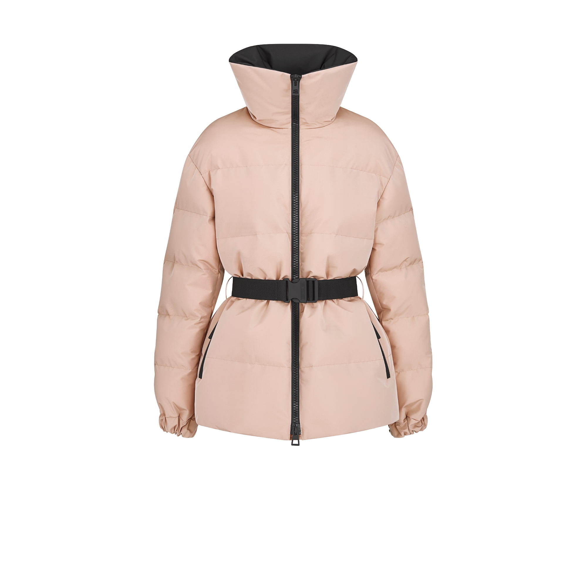 Part of the DiorAlps capsule, the puffer jacket reimagines the winter sports universe with the House's couture codes. Crafted in pink quilted technical taffeta, it showcases the black Dior Star motif embellished with the Christian Dior signature on the back. Featuring interior zip pockets, the style is enhanced by a stand collar and technical belt highlighting the waist. The elegant and practical puffer jacket can be worn with other creations from the DiorAlps capsule.