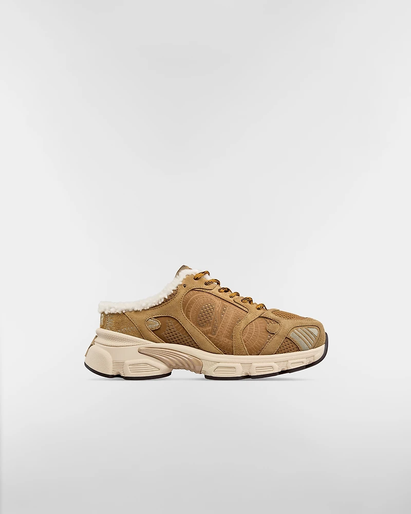 Part of the DiorAlps capsule, the Dior Chrono sneaker revisits the running shoe with the House's couture codes and an open heel. Pairing beige mesh with tonal suede calfskin panels and white lambskin shearling-effect lining, it is accented by hallmark details like the CD signature on the sides, a star patch on the tongue and a rear Dior signature. Featuring two-tone laces and an ultralightweight sole adorned with a star, the sneaker can be paired with other DiorAlps creations.