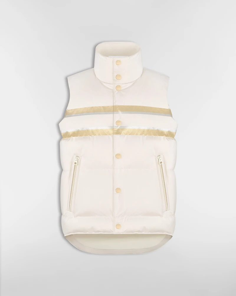 Part of the DiorAlps capsule, the puffer vest reimagines the winter sports universe with the House's couture codes. Crafted in white quilted technical taffeta, it showcases the Dior Star motif, as well as the Christian Dior signature on the back. Featuring practical zip pockets, the elegant and practical puffer vest can be worn with other creations from the DiorAlps capsule.