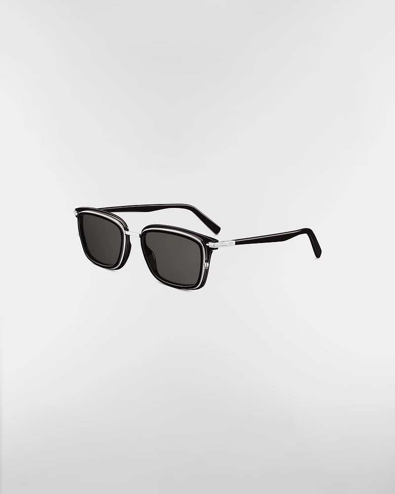 The DiorBlackSuit S18U sunglasses showcase casual elegance with a rectangular shape. The black frame features fine struts and subtle silver-finish metal edging to highlight the gray lenses, while the silver-finish metal bridge and hinge accentuate the style's sleek elegance.