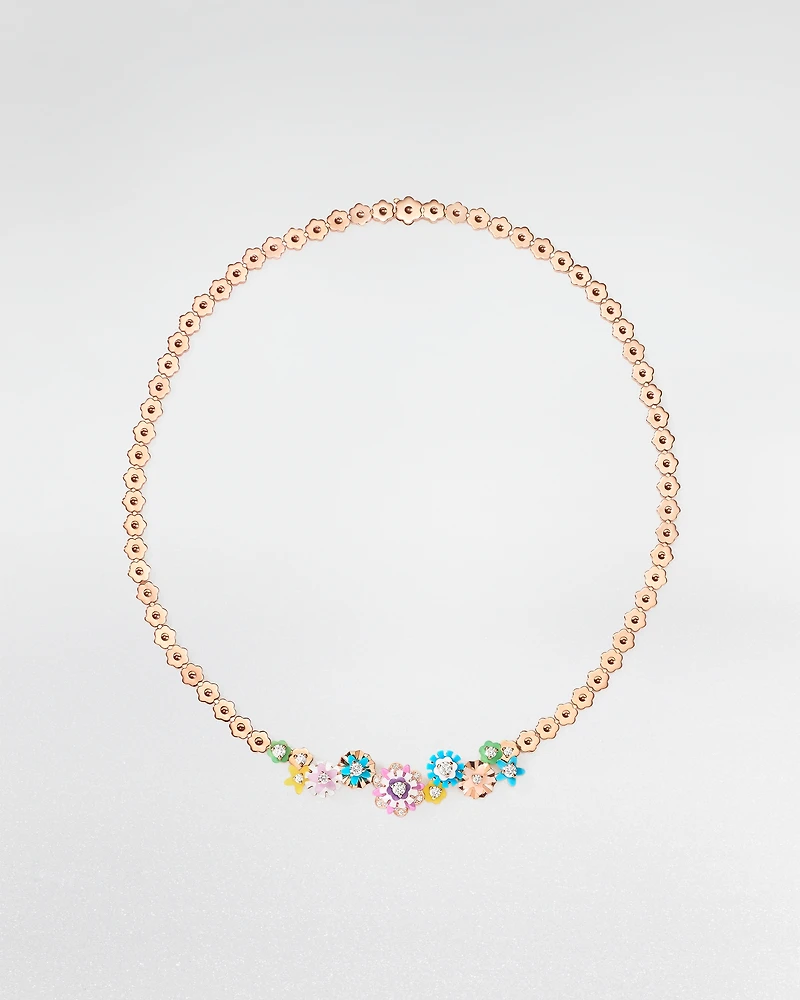Inspired by nature and couture, the Diorigami collection unveils a colorful, stylized interpretation of the Japanese art of origami through a subtle interplay of volume and light. Victoire de Castellane imagines a playful and exquisite garden, where each creation is enhanced by the harmony of gemstones, diamonds, and lacquer. Distinguished by its graphic flowers and vibrant hues, the Diorigami necklace is like a bouquet of floral sequins. Made up of precious floral links, the chain delicately adorns the neckline, enhancing the sparkle of the gemstones.