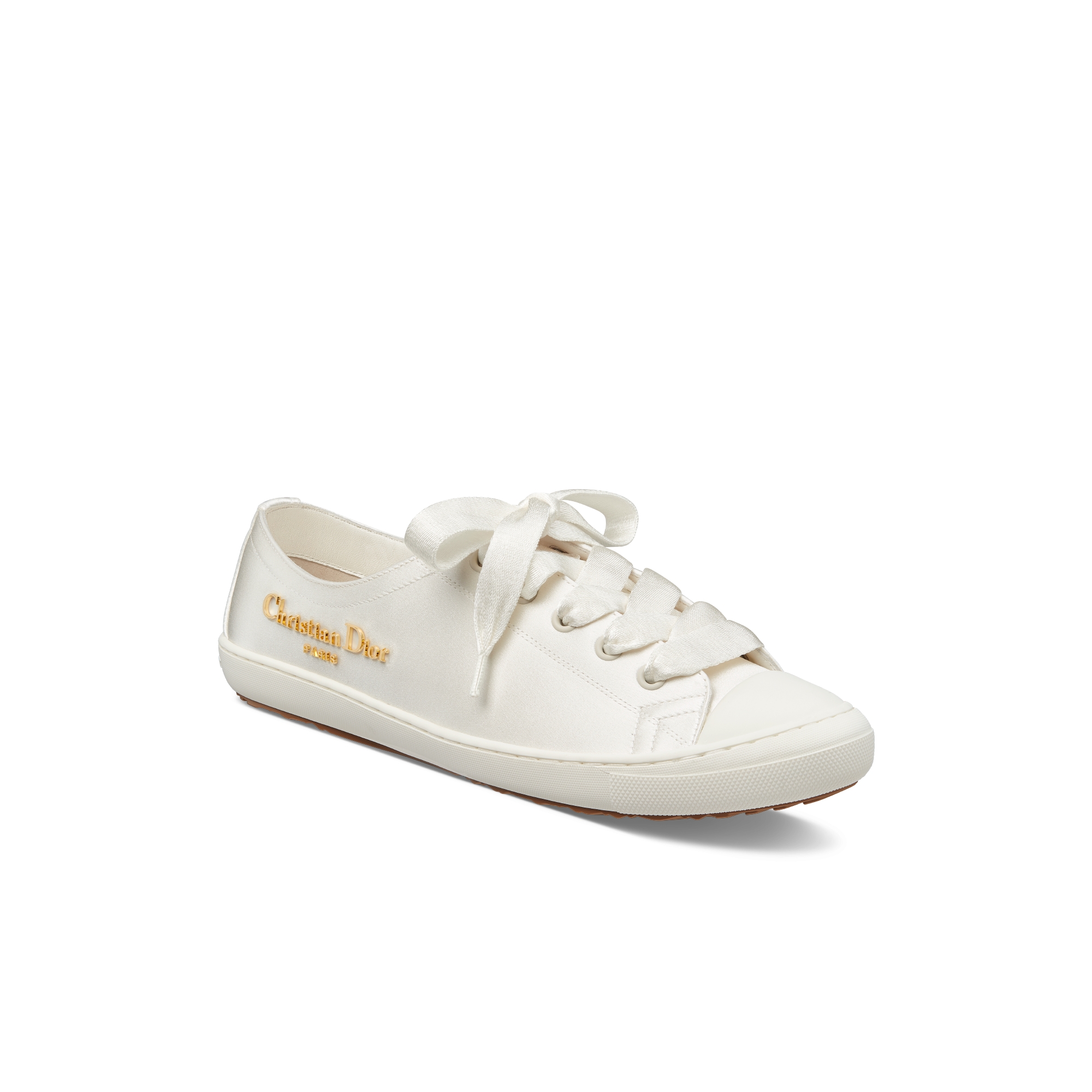 Part of the Dioriviera capsule, the Dior Lucky sneaker exudes elegance. The white satin upper is enhanced by a gold-finish metal Christian Dior Paris signature on the sides, while wide laces in tonal satin accentuate its retro inspiration. Featuring a rounded toe and thin white rubber Christian Dior Paris sole, the sneaker will lend a couture touch to casual looks and can be paired with other Dioriviera capsule creations. Main composition: technical fabric and cotton. Technical fabric and lambskin lining. Gold-finish metal Christian Dior Paris signature on the side. TPU insole. Rubber sole with star, Christian Dior's lucky symbol. Made in Italy. Additional set of laces provided