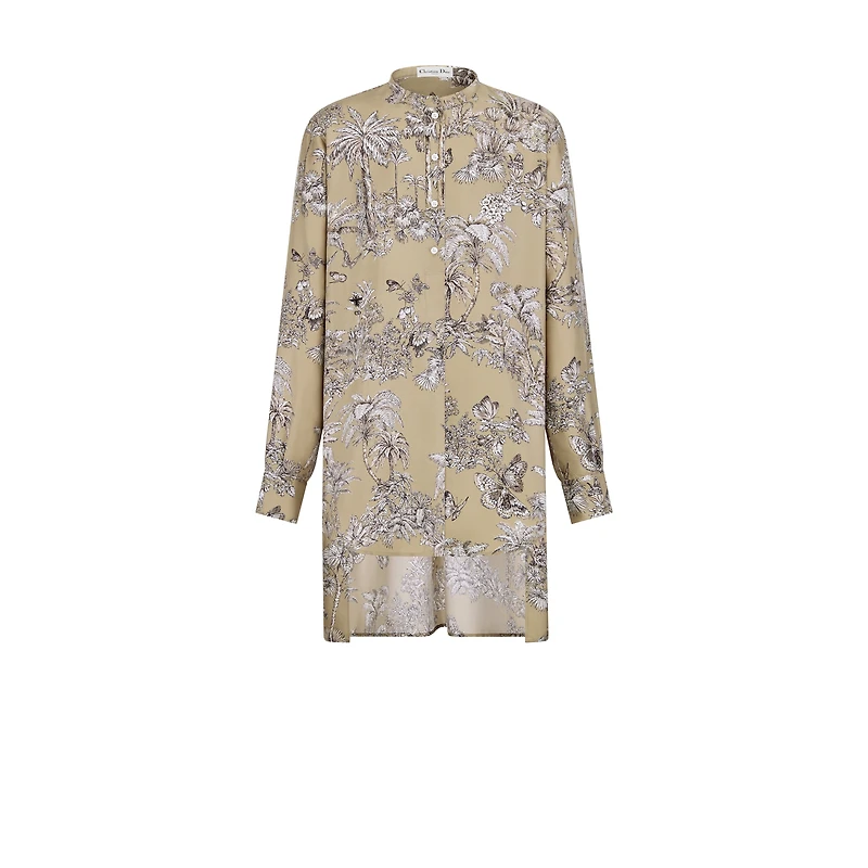Part of the Dioriviera capsule, the blouse showcases the Toile de Jouy Sauvage motif, a variation of the iconic House pattern. Crafted in white and lily of the valley green cotton muslin, it features a modern cut that is longer in the back, an officer collar and a front button closure. The blouse can be styled with a leather belt to define the waist and other Dioriviera creations to complete the look. Embroidered hallmark bee and CD signature. Front button closure. Christian Dior Paris mother-of-pearl buttons. Buttoned cuffs. Unlined. 100% cotton*. Made in Italy