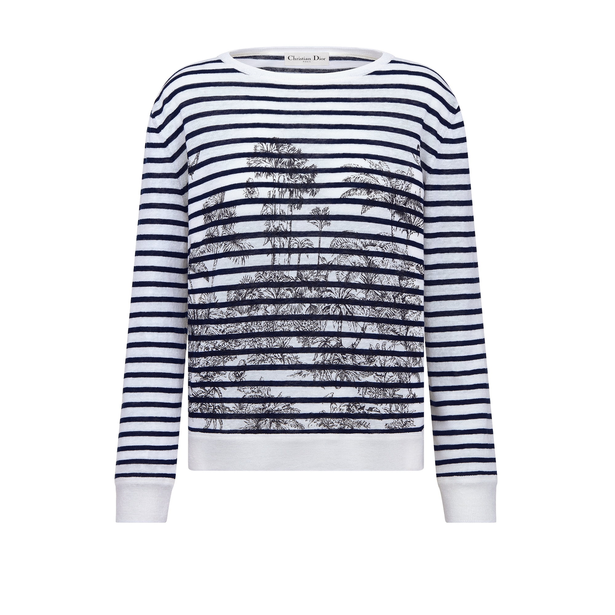 Part of the Dioriviera capsule, the sweater showcases Pietro Ruffo's Toile de Jouy Palms motif, capturing the beauty of nature with a vibrant jungle scene populated with diverse wildlife. Crafted in a linen, cashmere and silk knit with a navy blue and white D-Stripes pattern, it features a regular fit and ribbed trim. Embellished with the Christian Dior Paris signature on the back, the sweater can be coordinated with other Toile de Jouy Palms creations to complete a Dioriviera look.
