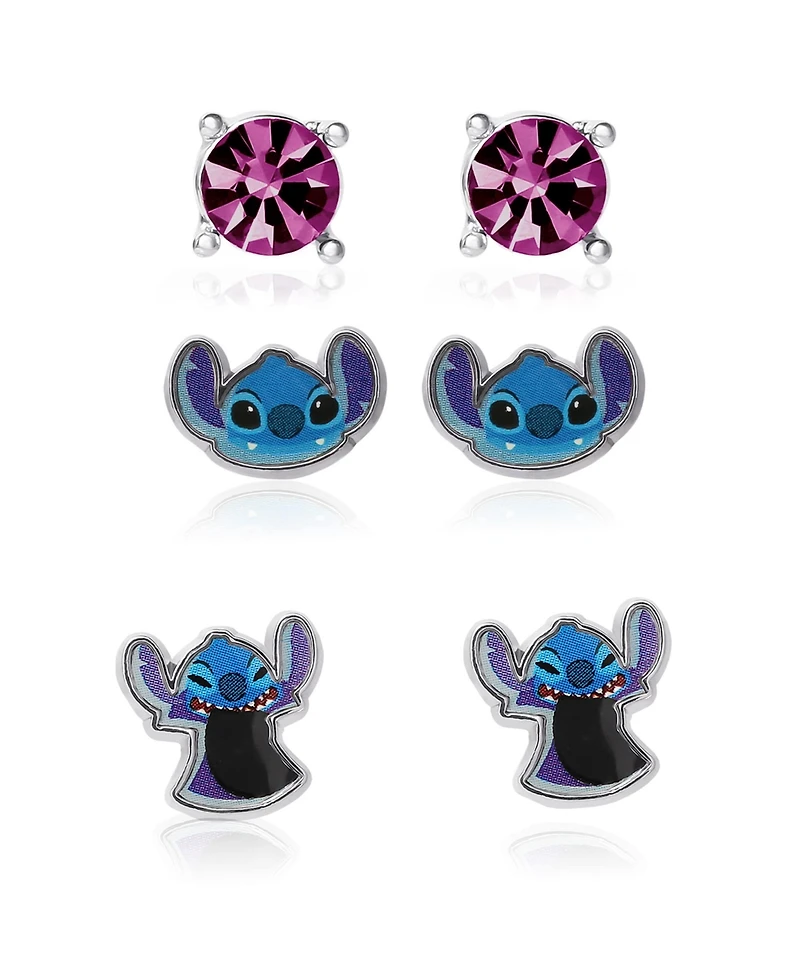 Officially Licensed Disney Jewelry: Make a statement with Lilo and Stitch's adorable Experiment 626 stud earring set. 3 Pretty Pairs: Includes one pair of sparkling Purple Crystal studs, one pair Stitch Face studs, and one pair Stitch Figure studs