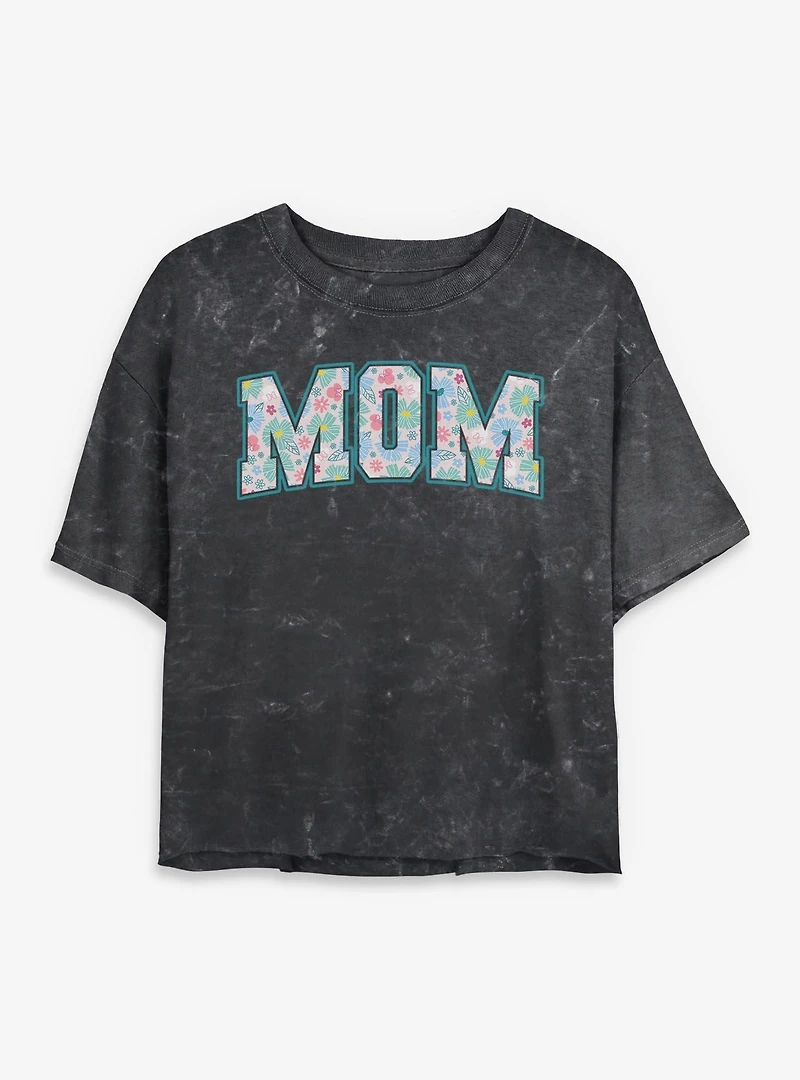 Product ID: 36585018 Disney Minnie Mouse Mom Collegiate Floral Print Mineral Wash Womens Crop T-Shirt
